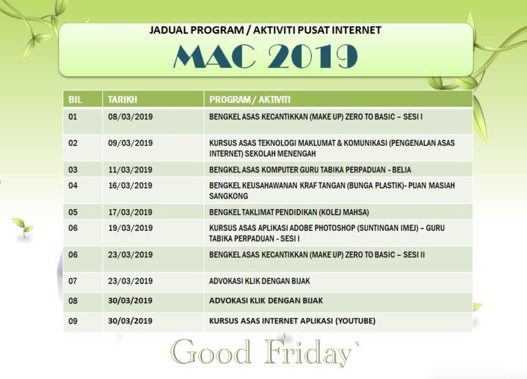 Tarikh : 16 Mac 2019 Masa : 9.00AM – 1.00PM 2.00PM – 3.00PM Lokasi : PI1M Pekan Baru Pitas Peserta : 30 […]